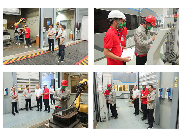 在搅拌车自动焊接线实操考试现场,选手们对机器人进行编程、设置参数,根据工件需要焊接的位置,反复调整机器人的运动轨迹,力求做到焊接时的准确度。裁判员们根据程序编写、焊接效率、焊接位置、焊缝完整度等指标进行评判。贾主席一行在考试工位前驻足,不时询问设备运行情况,详细了解选手们操作流程,对大家精彩表现表示肯定。