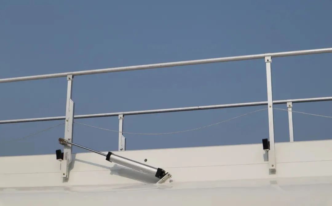 罐顶气动护栏,操作方便快捷;拉出按钮,护栏升起;按下按钮,护栏下降。罐顶有它,安全倍加。